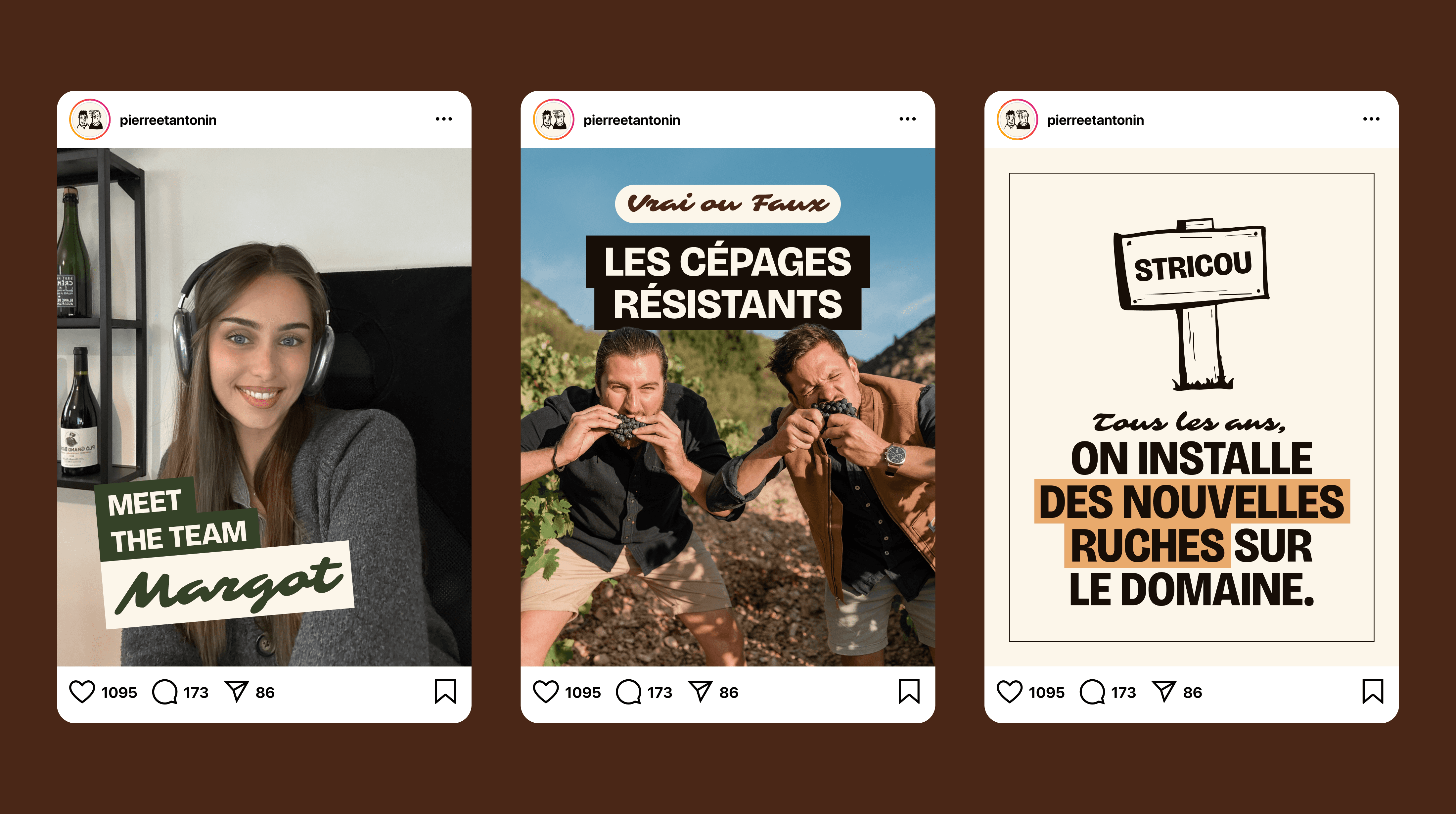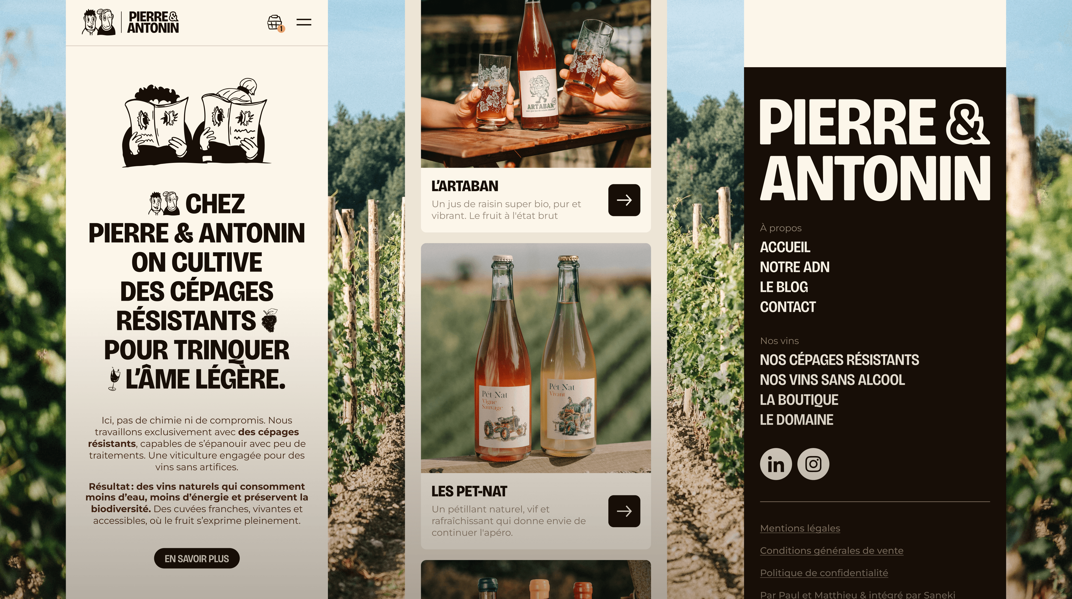Aux côtés de Matthieu Hoogeboom, nous avons repensé l’ensemble de leur direction artistique : typographies, palette chromatique, mise en page, ton éditorial et expérience digitale. Le résultat : une identité rafraîchie, harmonieuse et déclinable, qui redonne du sens à chaque bouteille signée Pierre & Antonin.