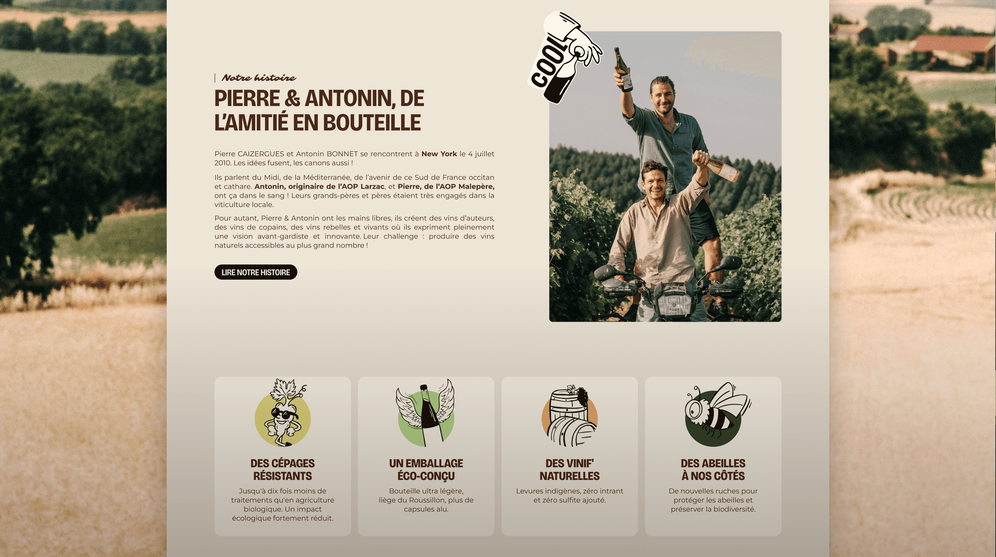 Pierre & Antonin, deux vignerons passionnés du Languedoc, souhaitaient moderniser leur image tout en préservant l’authenticité de leur histoire. Ils nous ont contacter pour repenser leur univers digital et redonner souffle à leur communication visuelle.