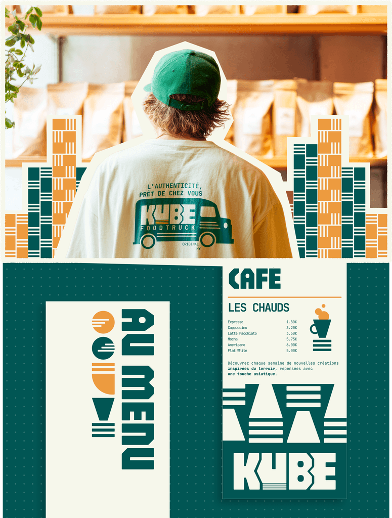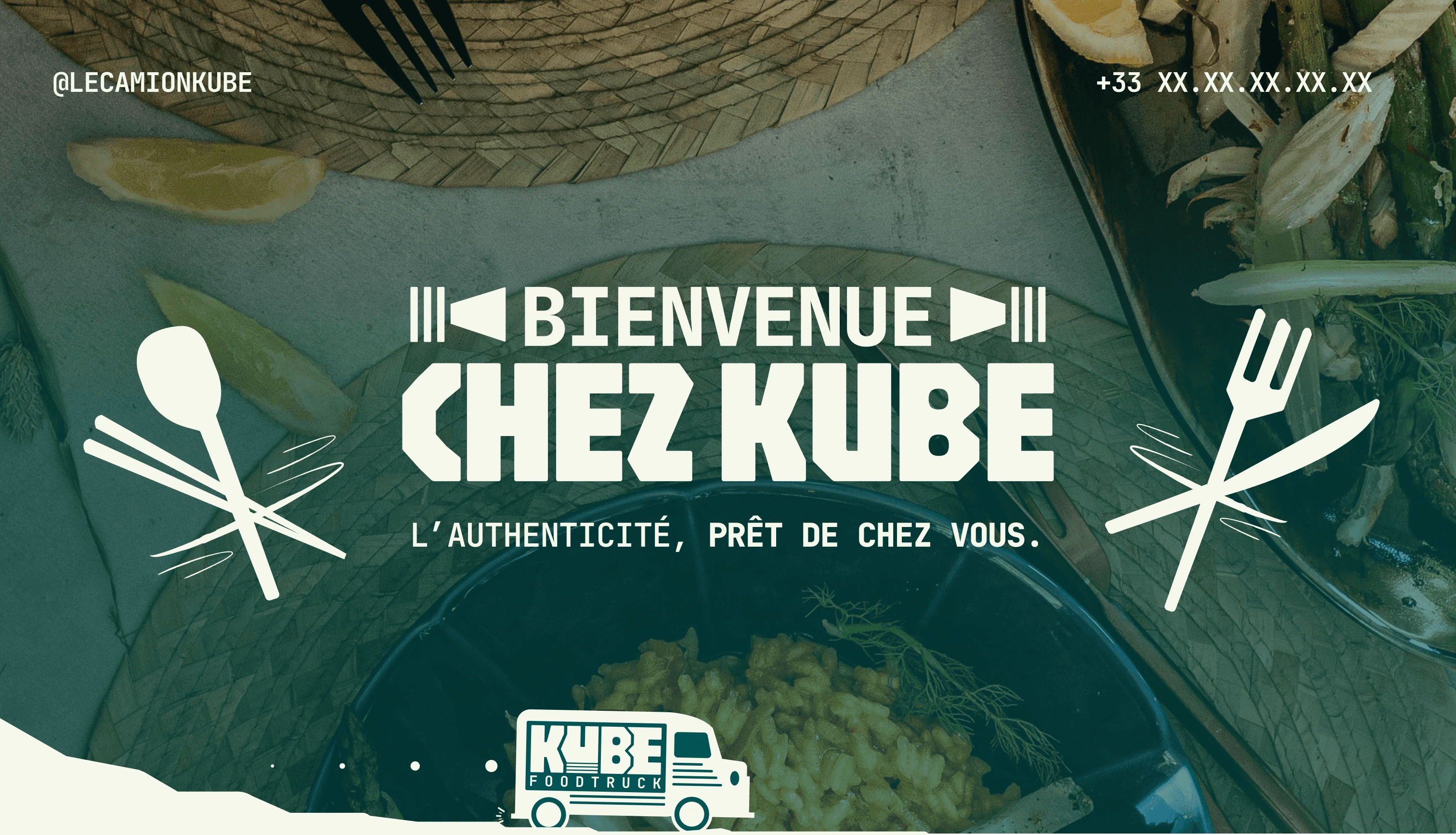 L’identité visuelle du Camion KUBE a été pensée comme une signature forte et accessible, avec un logo sur-mesure intégrant l’illustration du camion pour créer une marque immédiatement reconnaissable. L’univers graphique se décline avec cohérence sur l’ensemble des supports, du marquage du camion aux visuels digitaux, dans un style "street-food locale" mêlant esthétique vintage et direction artistique contemporaine.